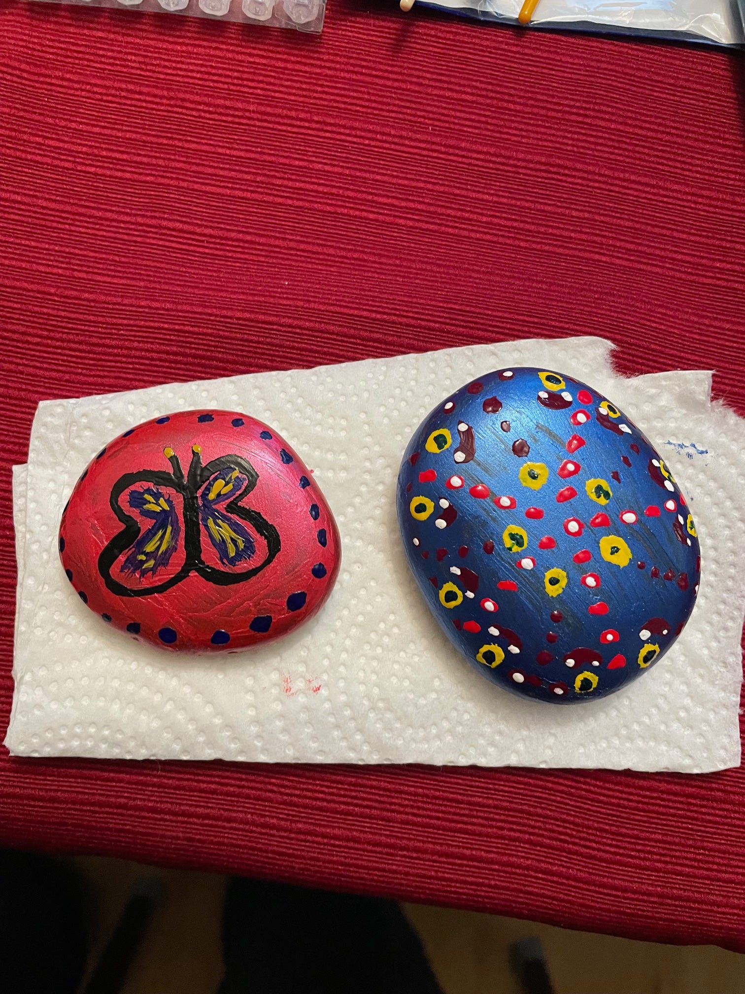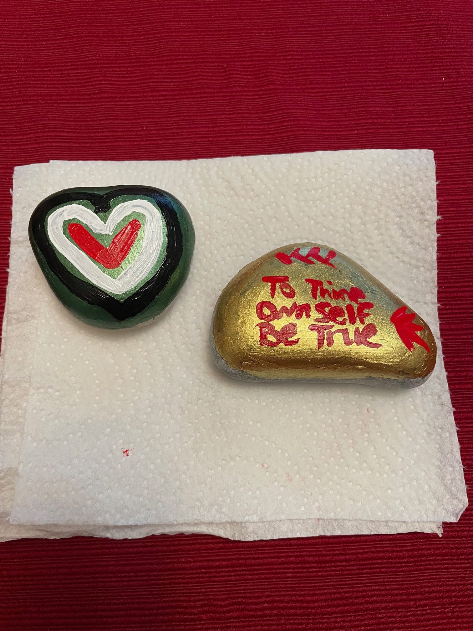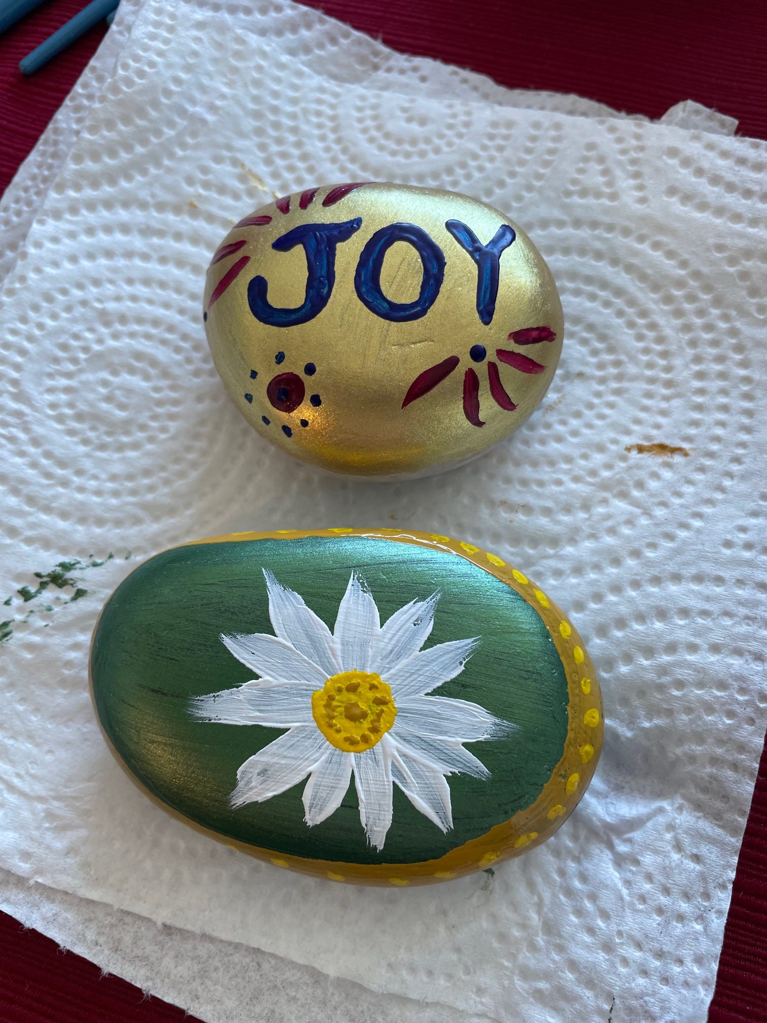 Having already learned about the basics of these sorts of rocks, I had some idea of how to proceed, but I was kind of learning by the seat of my pants. I was glad that I decided to start by painting the rocks with a solid background color. After that dried, I used acrylic paint to design my first two rocks from images in my mind’s eye.