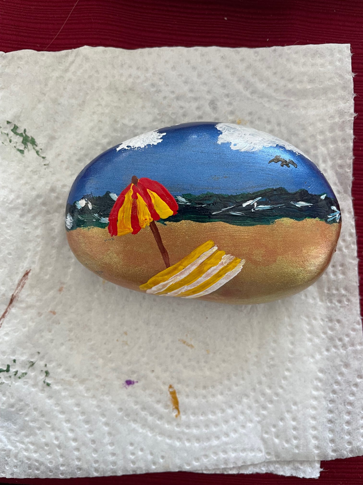 By my fifth rock, I got even bolder and decided to paint a “Florida beach scene.” This was because I planned to surprise my sister with this Kindness Rock as a little gift to remember our arts-and-crafts time. While I’ve still got a lot to learn and future beach scene rocks will have greater technical proficiency, you can have a “first one” only once. Happy birthday, Dear Amy!