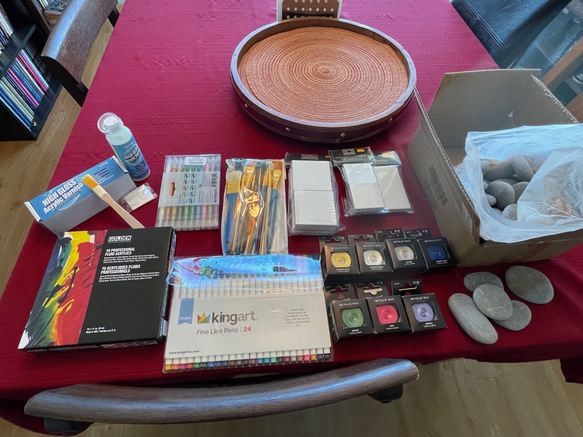 While those were drying, I decided to look up more about the whole process. Learning that it’s strongly advised to protect your rock’s painting from the elements with a finish, I ordered nontoxic acrylic varnish. When that arrived the next day (thanks to Amazon), we were able to varnish our first batch of painted rocks.