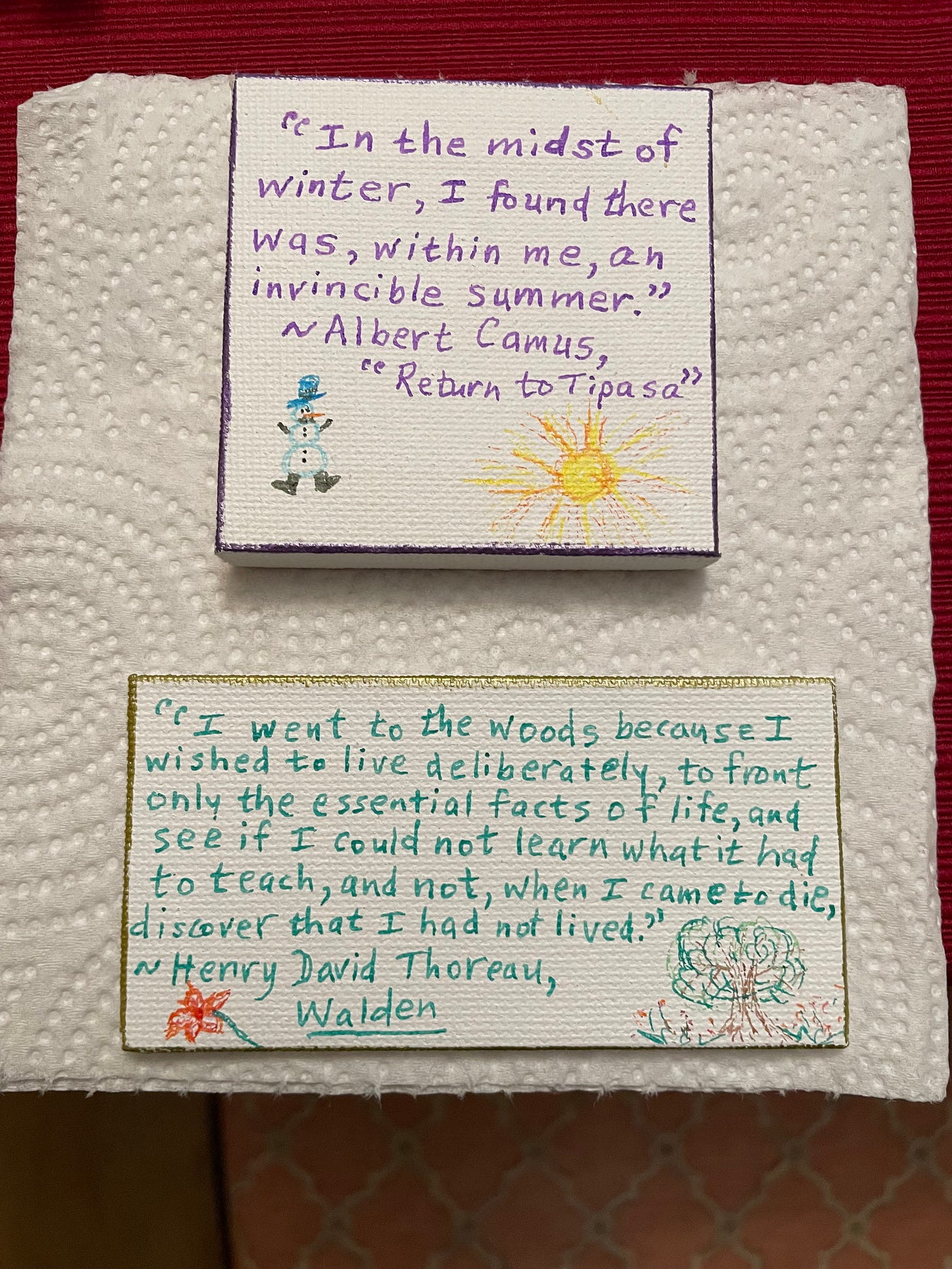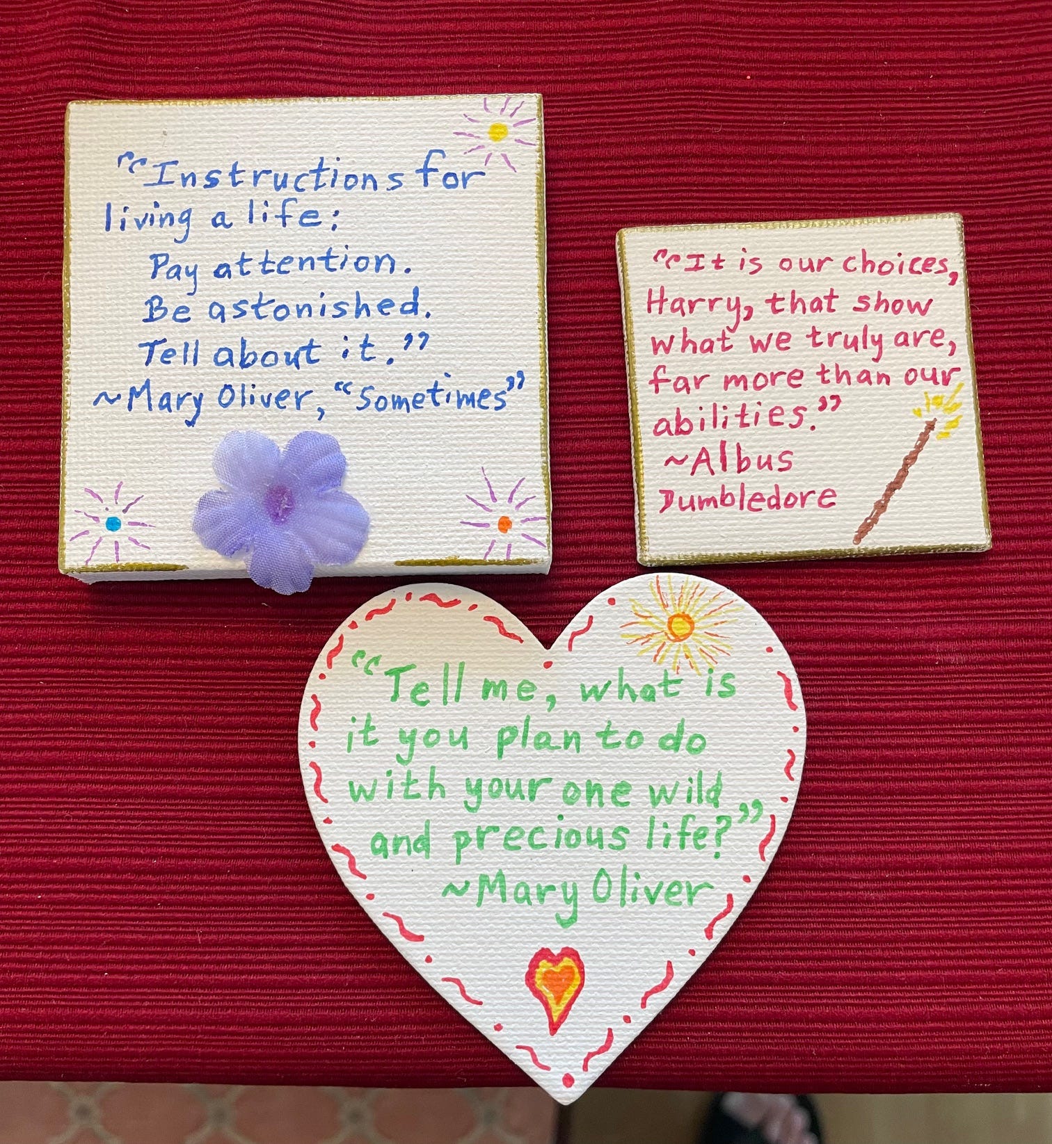 Given the tiny amount of space on a tiny canvas, I quickly realized that it would work best to use brief extracts from some of my favorite passages. Sources ranged from Mary Oliver to Albus Dumbledore.