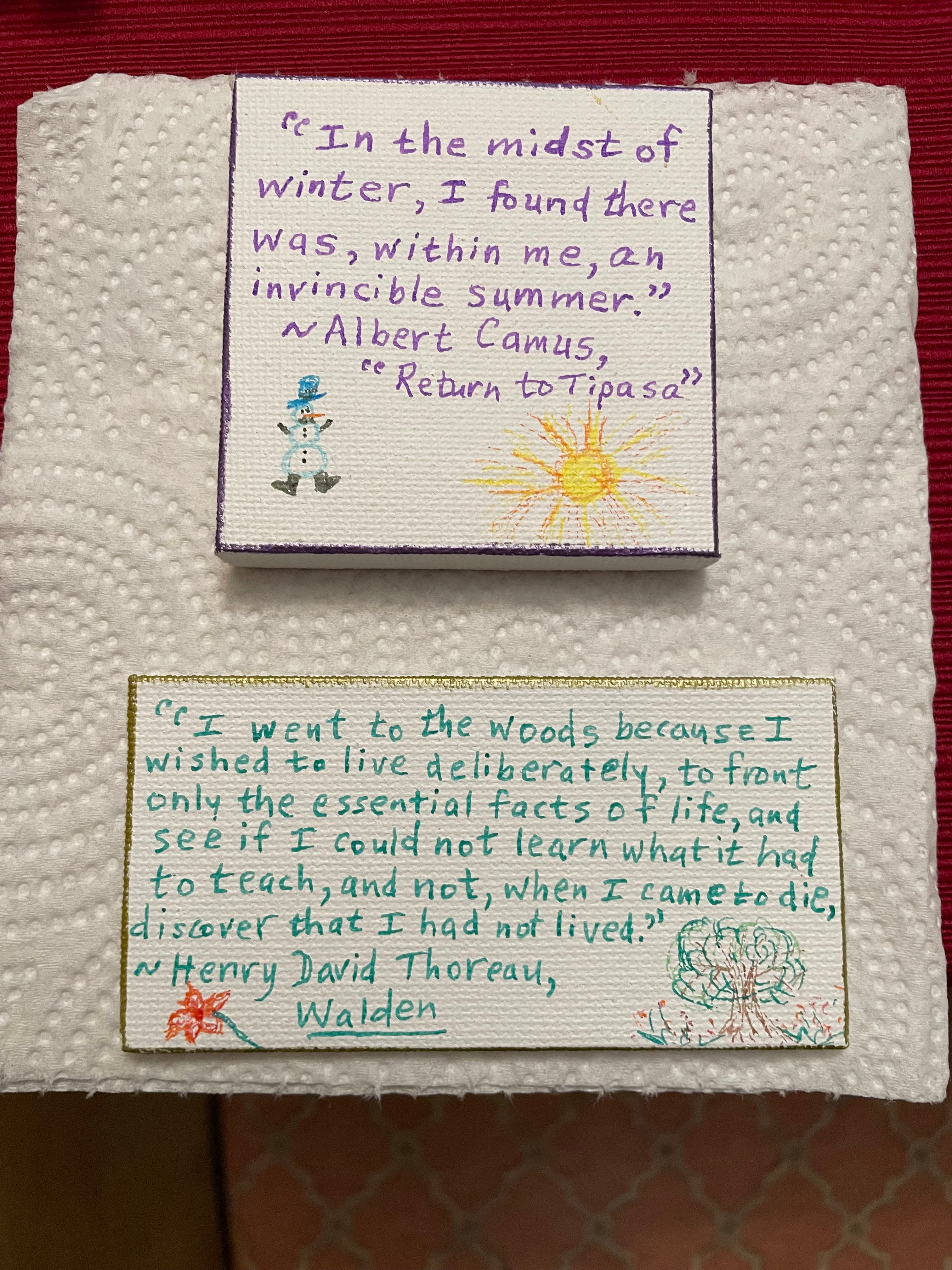 As I am no Bouguereau, I figured that I’d start out with something simple: favorite quotations. I did, though, add small, related doodles around the quotations as a fun touch. The first one I created is from Thoreau’s Walden, which is the quotation I would like carved on my headstone when that time arrives. The second is an inspiring one from Camus.